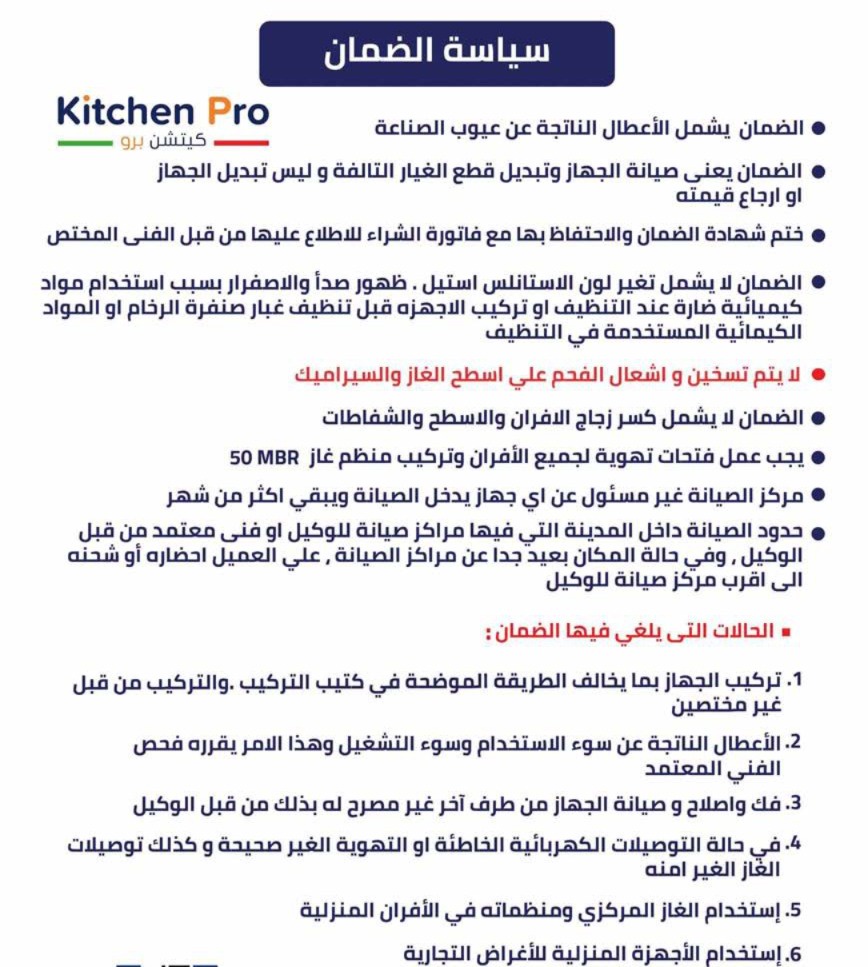 (6) الضمان لا يشمل كسر زجاج الأفران والأسطح والشفاطات.
