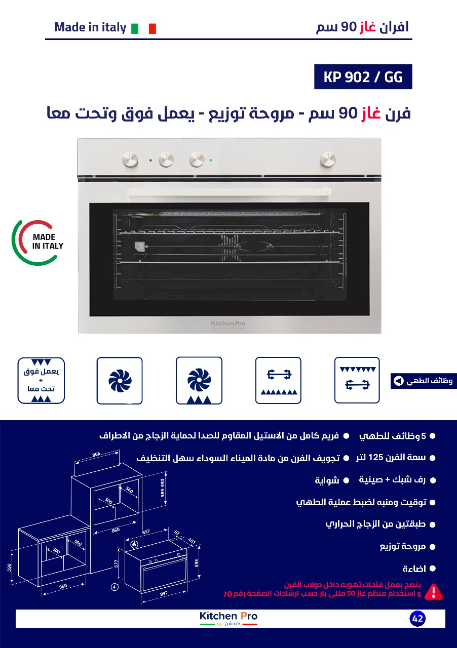 فرن غاز كتشن برو 90 سم. صناعة إيطالية، مروحة توزيع، شواية دجاج، ونظام أمان متطور. سهل التنظيف وعملي. تسوق الآن وجدد مطبخك! يعمل قفوق وتحت معا
