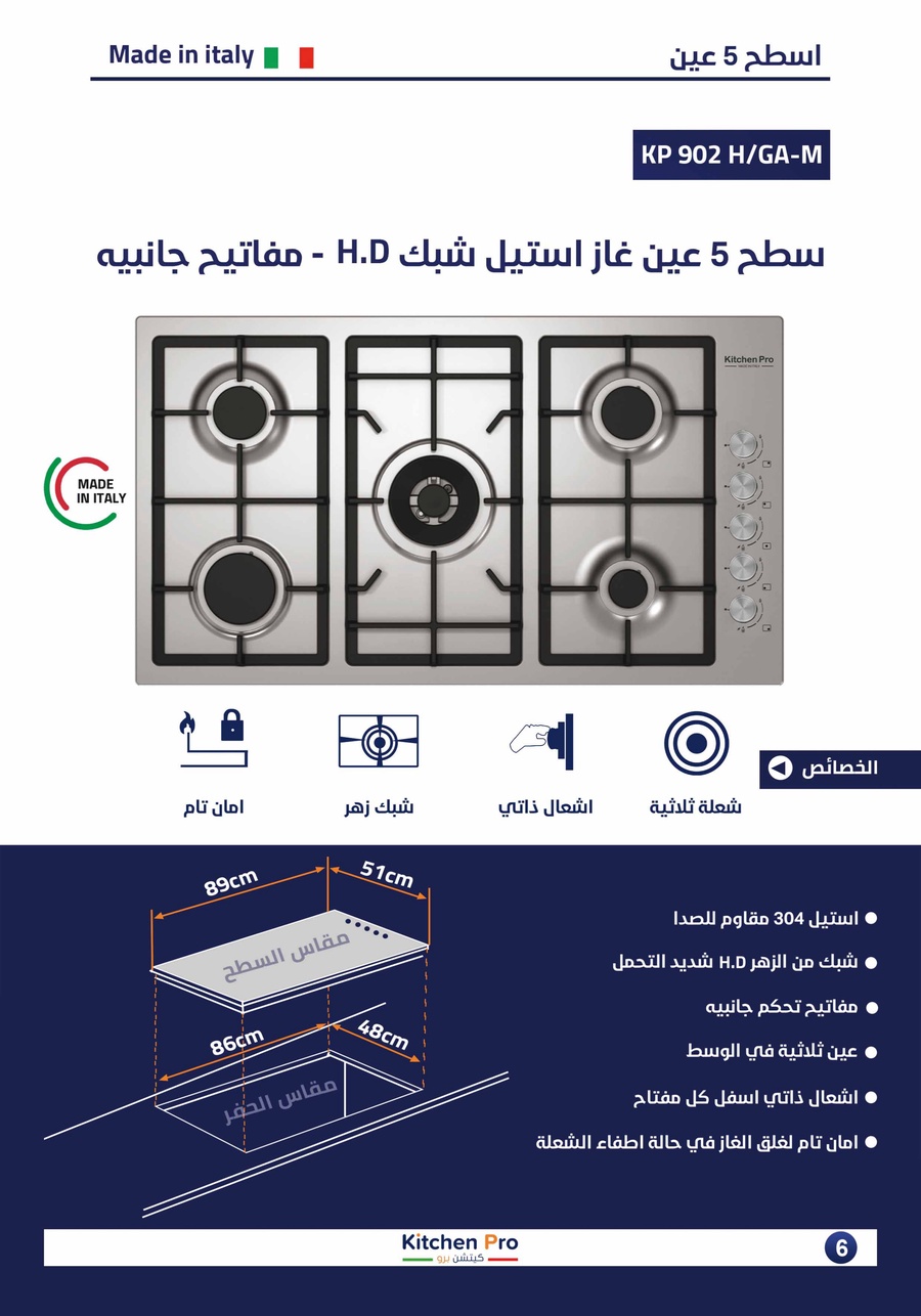 سطح بلت إن كتشن برو (صناعة ايطالي) ستيل 304 مقاوم للصدأ، شبك زهر HD، مفاتيح جانبيه، عين ثلاثية، إشعال ذاتي، أمان تام (SASO معتمد 100%). ضمان 3 سنوات.