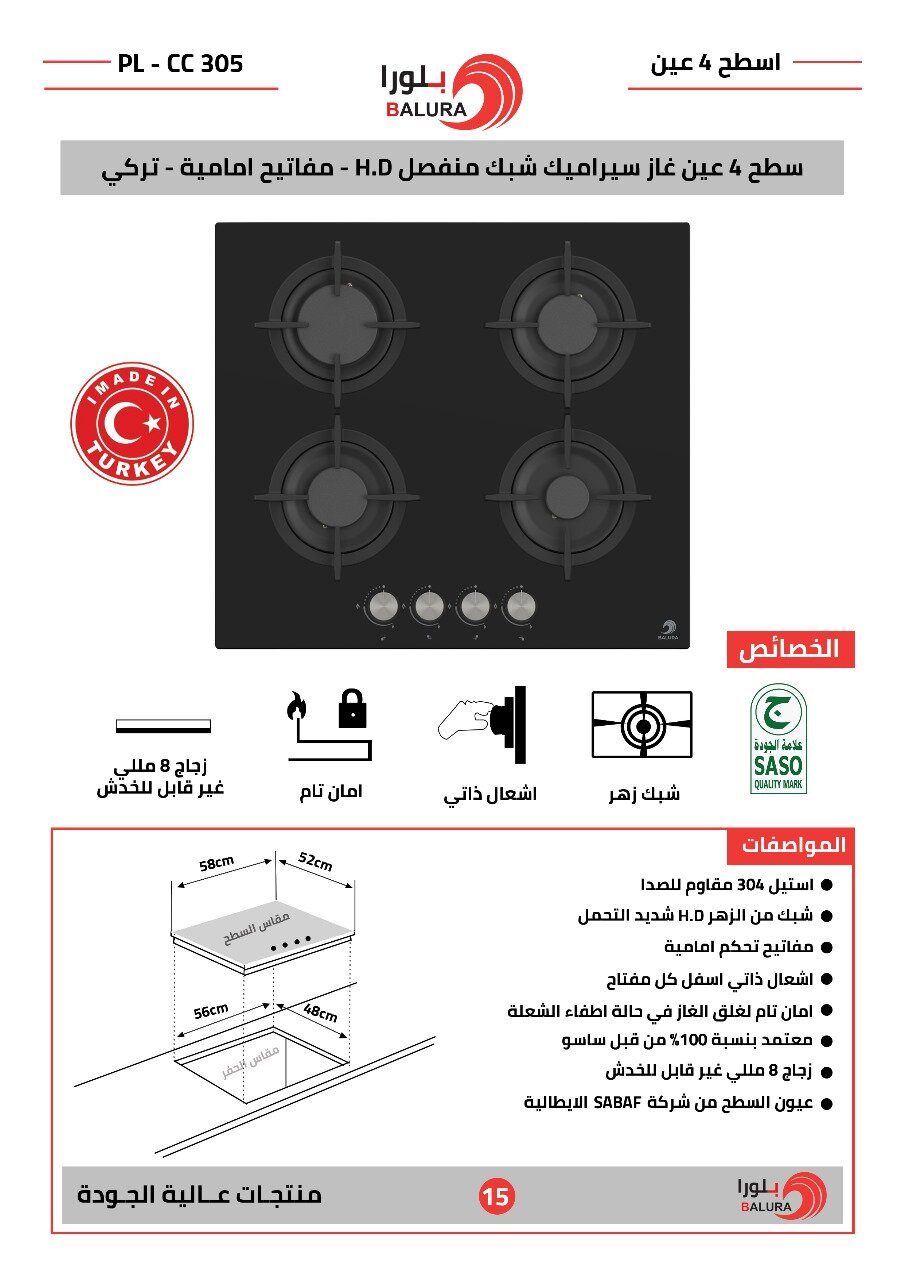 سطح بلت إن بلورا (صناعة تركي) ستيل 304 مقاوم للصدأ، شبك زهر HD، مفاتيح أمامية، ، إشعال ذاتي، أمان تام (SASO معتمد 100%). عيون SABAF إيطالية.