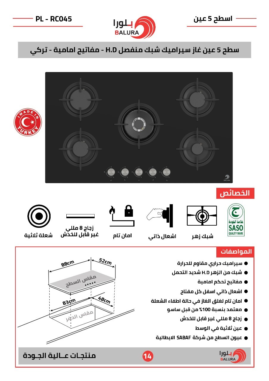سطح بلت إن بلورا (صناعة تركي) ستيل 304 مقاوم للصدأ، شبك زهر HD، مفاتيح أمامية، عين ثلاثية، إشعال ذاتي، أمان تام (SASO معتمد 100%). عيون SABAF إيطالية.