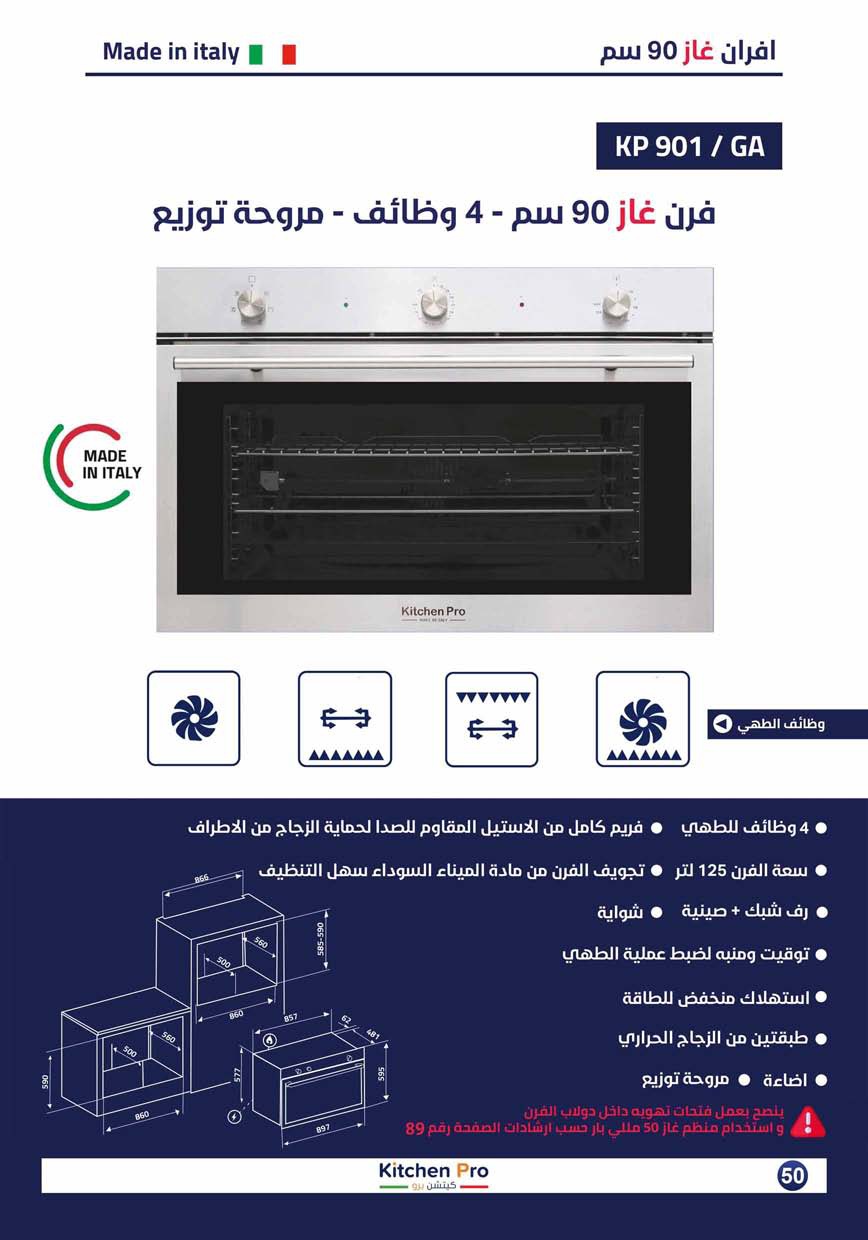 فرن غاز كتشن برو 90 سم. صناعة إيطالية، مروحة توزيع، شواية دجاج، ونظام أمان متطور. سهل التنظيف وعملي. تسوق الآن وجدد مطبخك! ✨