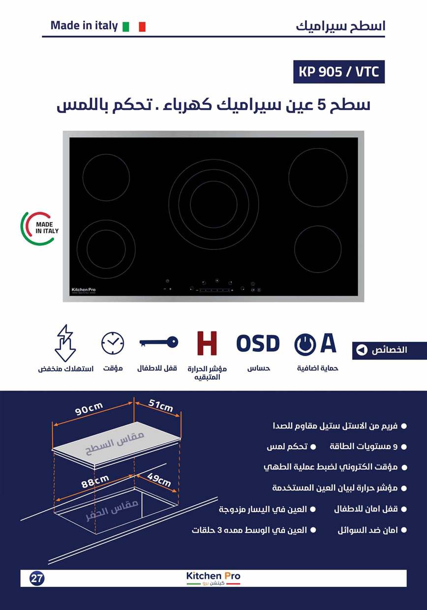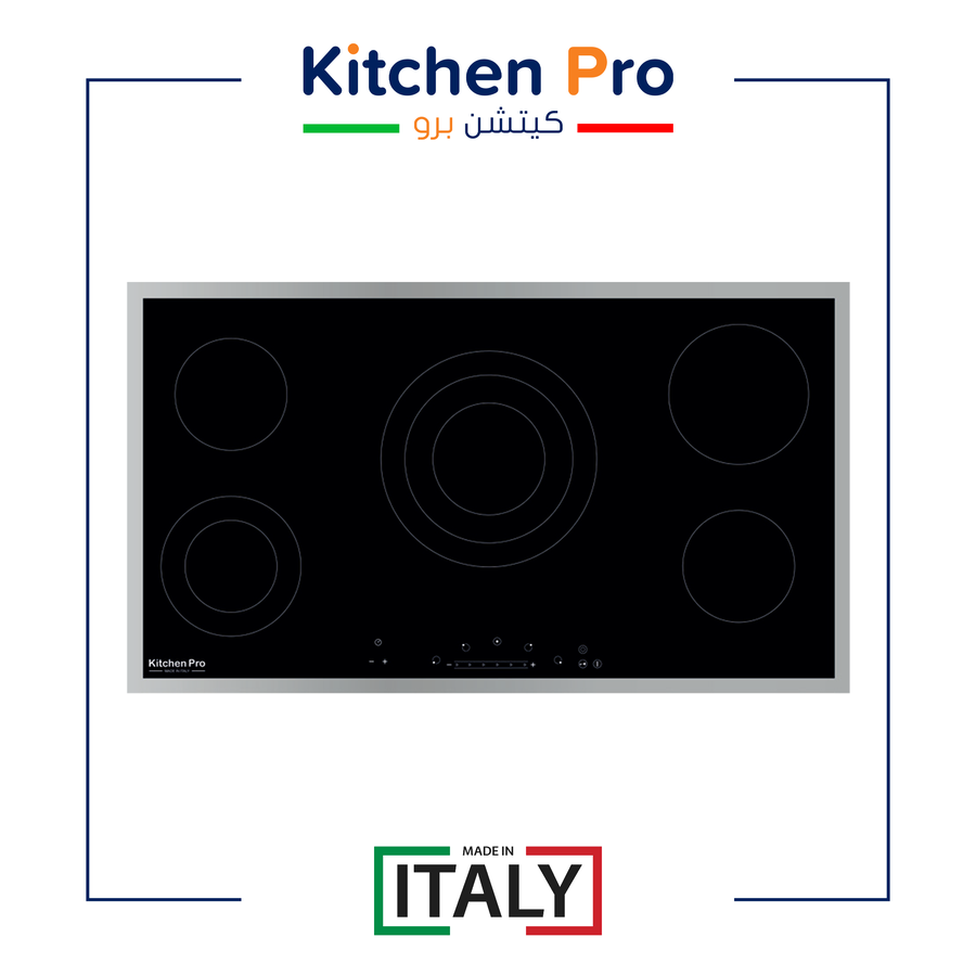 Kitchen Proسطح سيراميك بـ 5 مناطق طهي.عين مزدوجة ووسطى ثلاثية وفريم ستانلس ستيل، 9 مستويات طاقة، تحكم لمس، مؤقت قفل أمان، ومؤشر حرارة وأمان ضد السوائل.