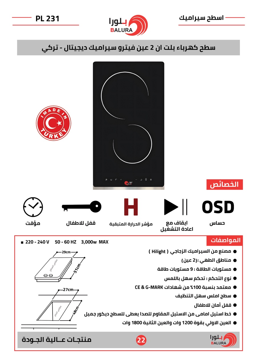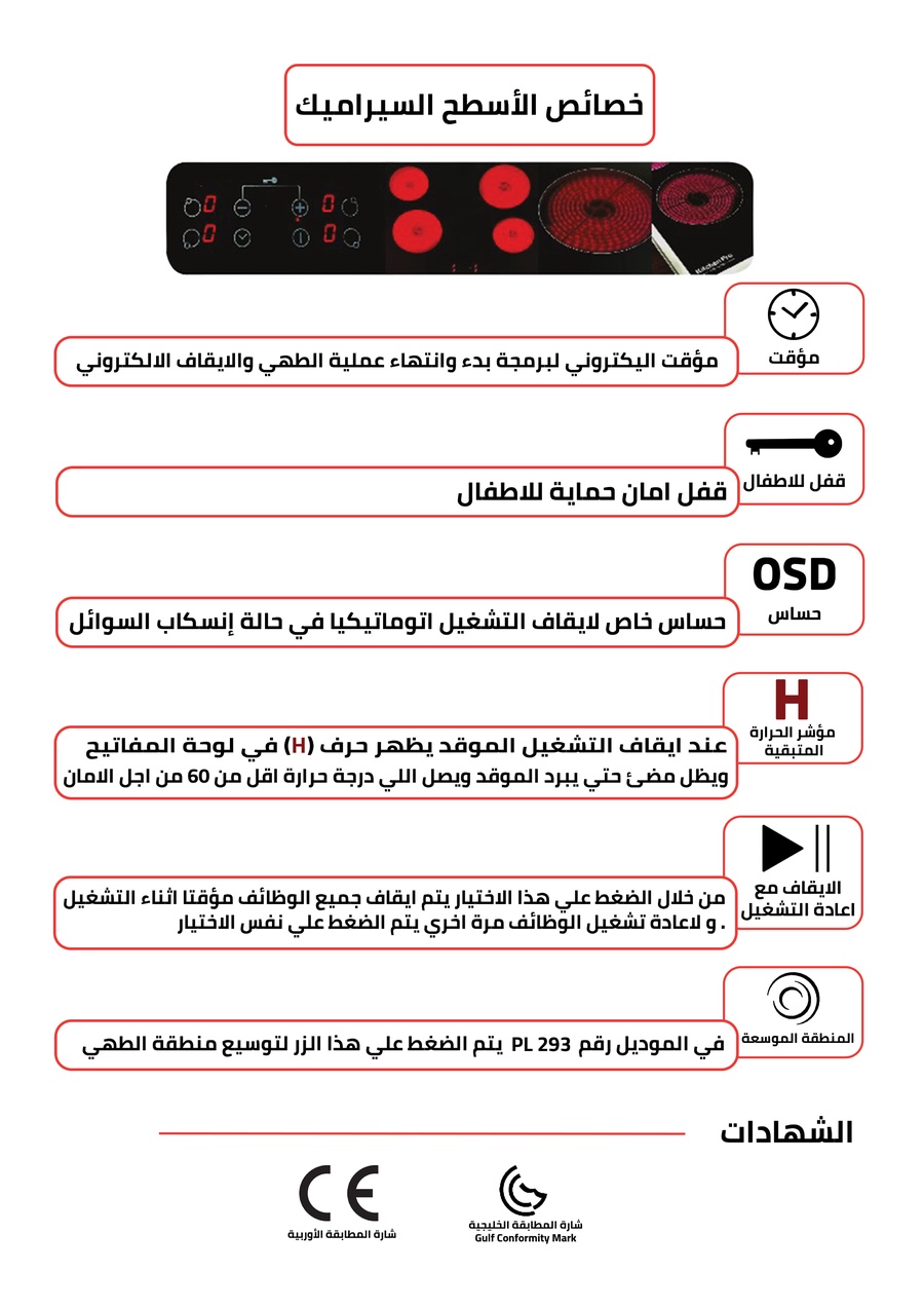 النوع: بلت-إن سيراميك (Hilight) مقاس 30 سم. العيون: 2 عين (1200W + 1800W). التحكم: باللمس (10 مستويات). الامان والتصميم: قفل أطفال + إطار ستيل أمامي.
