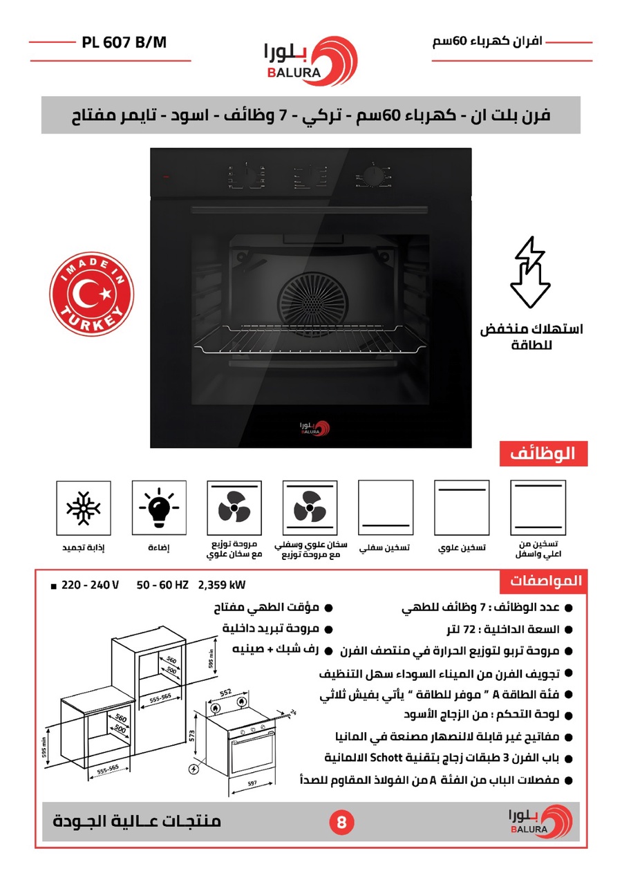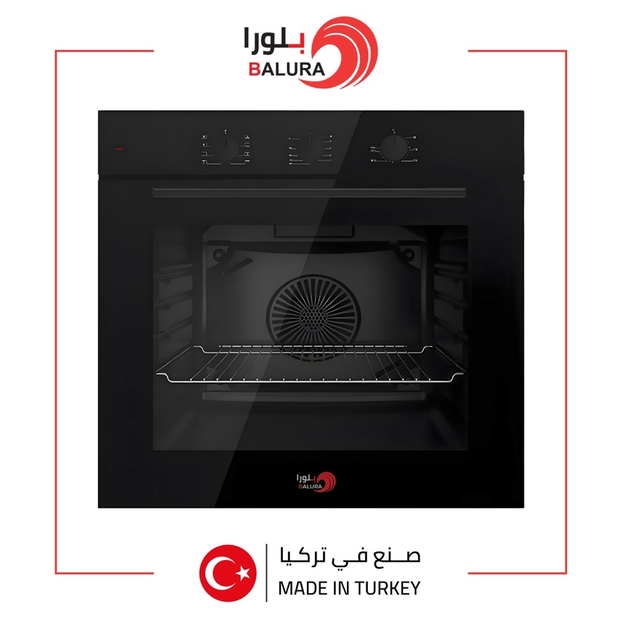 فرن بلت ان بلورا تركي (60x60سم)، 7 وظائف، 72 لتر. صناعة تركية بمواصفات ألمانية (زجاج Schott ومفاتيح)، طاقة A موفرة. تحكم ديجيتال ومروحة تربو.