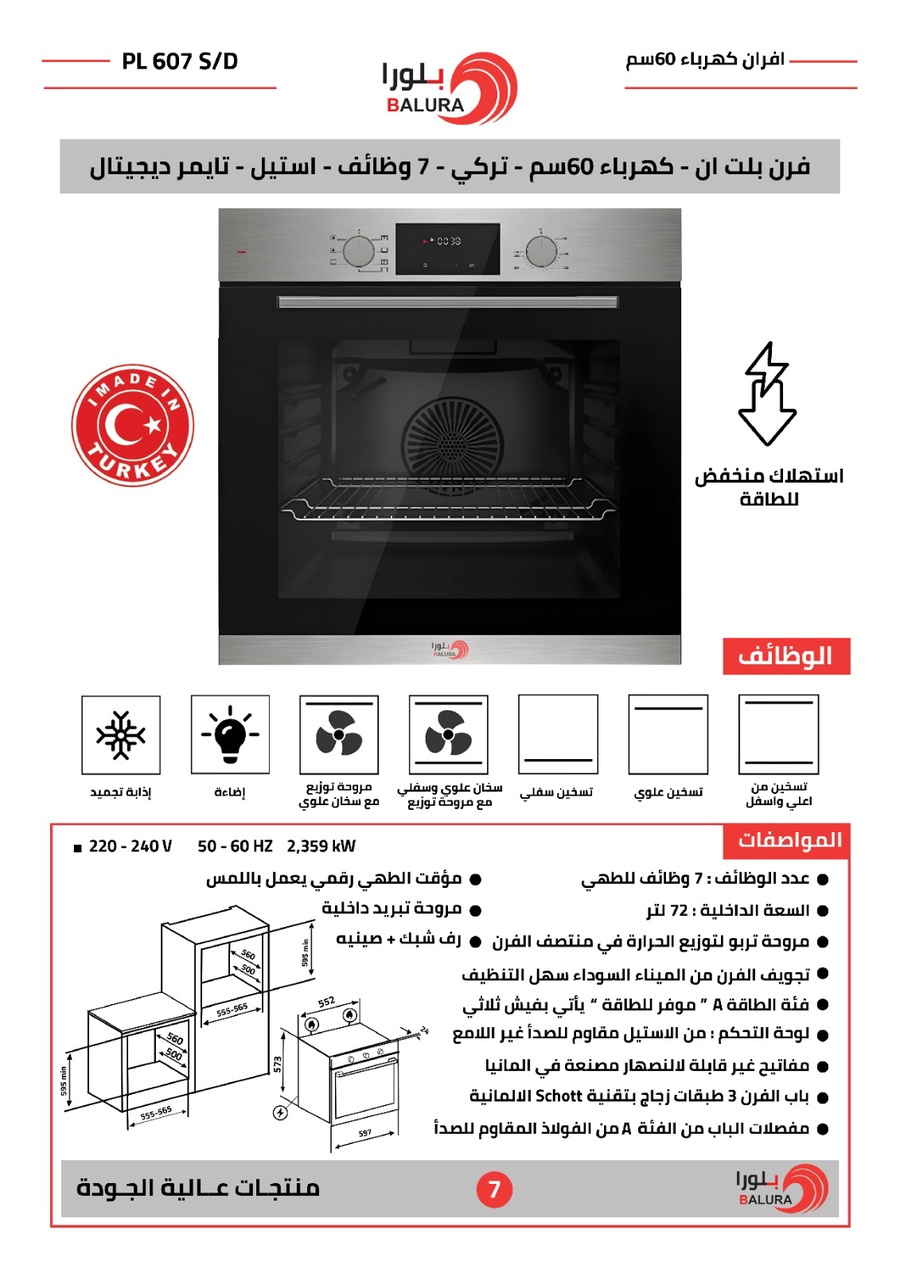 فرن بلت ان بلورا تركي (60x60سم)، 7 وظائف، 72 لتر. صناعة تركية بمواصفات ألمانية (زجاج Schott ومفاتيح)، طاقة A موفرة. تحكم ديجيتال ومروحة تربو.