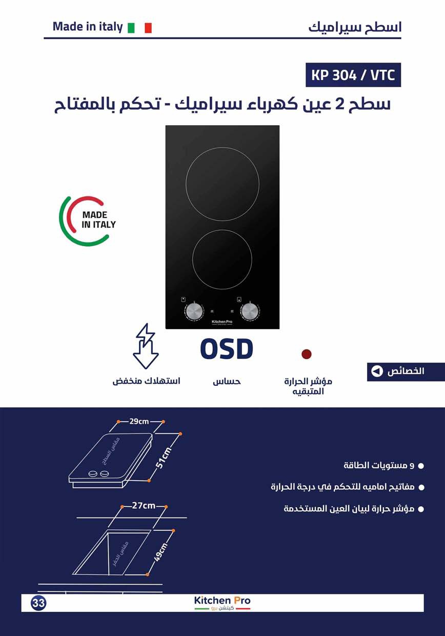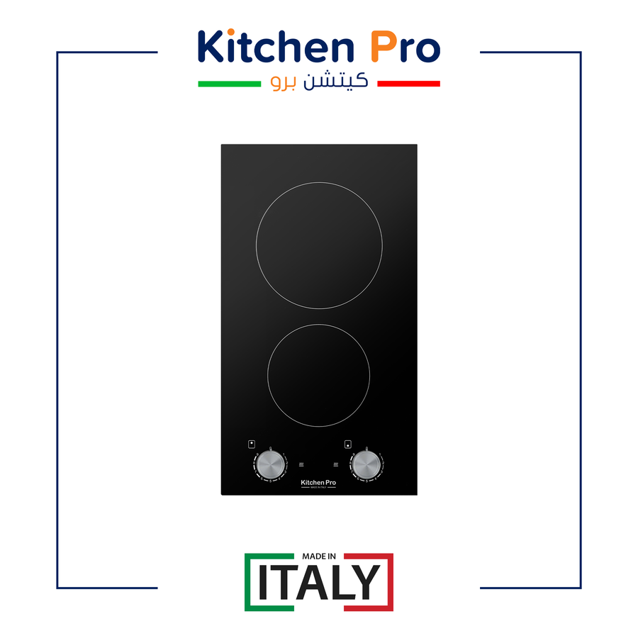 مواقد مسطحة (بلت إن) كتشن برو صناعة إيطالية: 2 عيون، مفتاح تحكم امامي 9 مستويات طاقة. ، مؤشر حرارة متبقية ومؤشر للعين المستخدمة. ضمان 3 سنوات