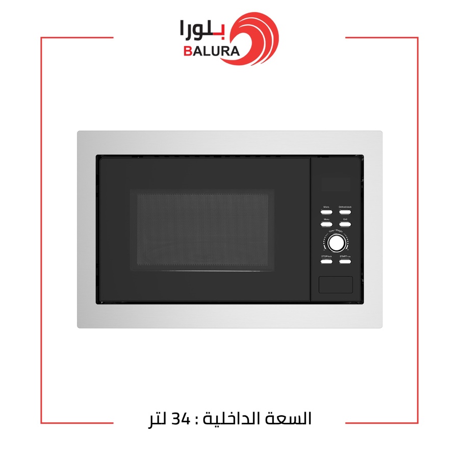 ميكرويف بلت ان بلورا 34 لتر، 1000 واط، بشواية 1100 واط. شاشة LED، 5 مستويات طاقة، تايمر، إذابة ثلوج، قفل أطفال، لوحة تحكم عربي.