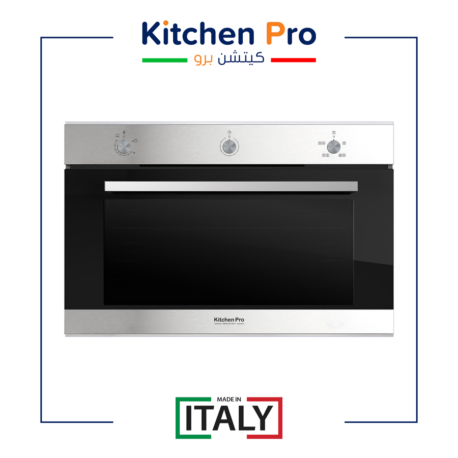 فرن غاز كتشن برو 90 سم. صناعة إيطالية، مروحة توزيع، شواية دجاج، ونظام أمان متطور. سهل التنظيف وعملي. تسوق الآن وجدد مطبخك! ✨