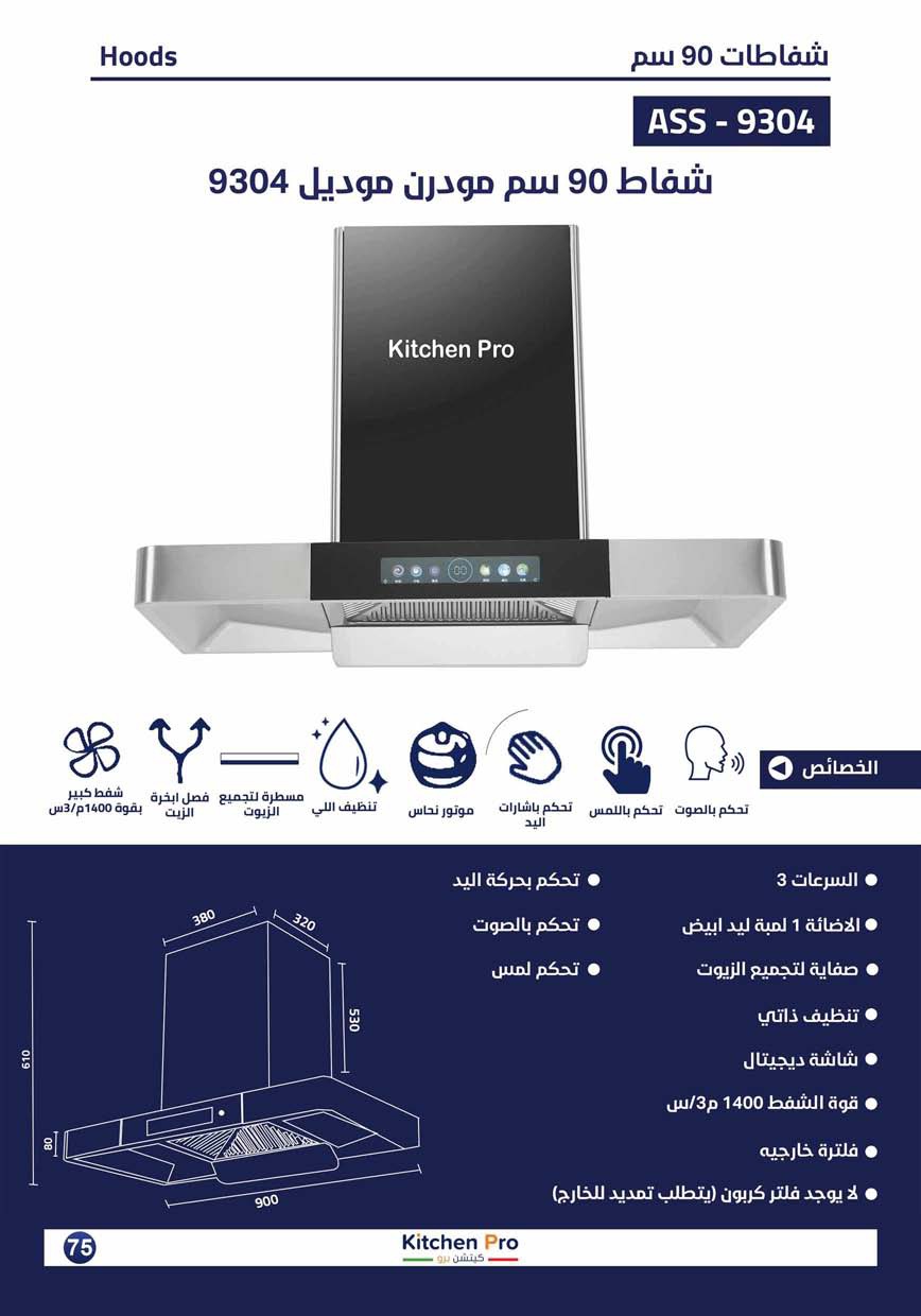 قوة شفط جبارة 1400 م³/س، 3 سرعات. تحكم باللمس، الصوت، والإشارة. تنظيف ذاتي وشاشة ديجيتال. مخرج خارجي فقط. إضاءة ليد بيضاء.كتشن برو